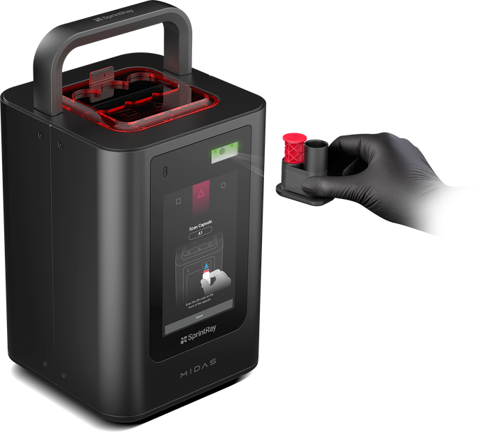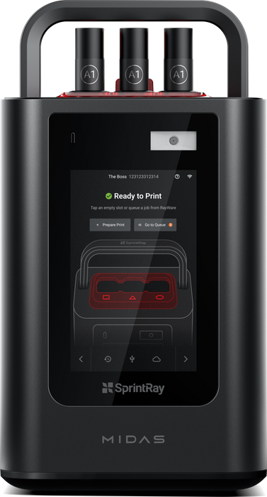 SprintRay Midas is a next-generation dental 3D printer engineered to transform how single-tooth restorations are produced chairside, directly in-office. Powered by patented Digital Press Stereolithography (DPS), Midas replaces traditional resin tanks and build platforms with an intuitive resin capsule system, enabling it to print highly viscous, ceramic-filled restorative materials with unmatched speed and precision. Clinicians can produce crowns, inlays, onlays, and veneers in under 10 minutes, all within a small footprint that integrates seamlessly into existing chairside workflows. Coupled with SprintRay’s AI-driven design tools, Midas delivers a fast, streamlined, and highly aesthetic solution for modern restorative dentistry — making same-day restoration a reality.