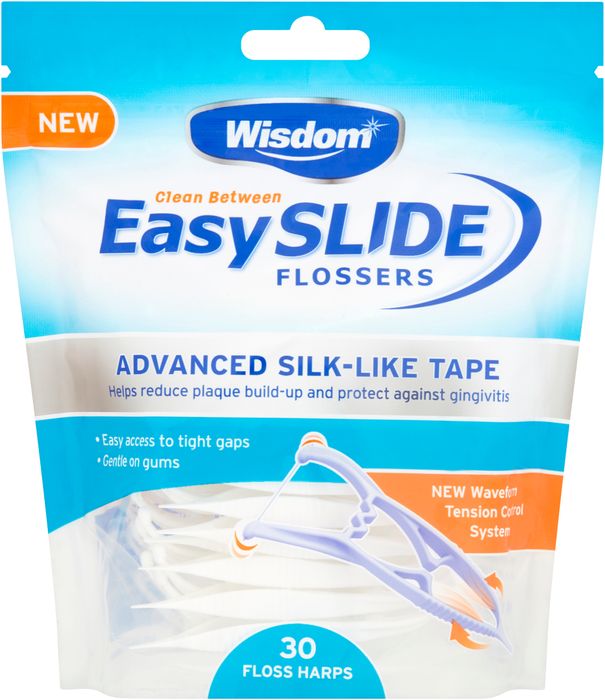 Wisdom Clean Between Easy Slide Flossers are designed with a waveform tension control system to hold the flossing tape taut, they slide effortlessly into even tight gaps between the teeth, helping to make it easier to remove plaque and food particles for cleaner, healthier teeth and gums.